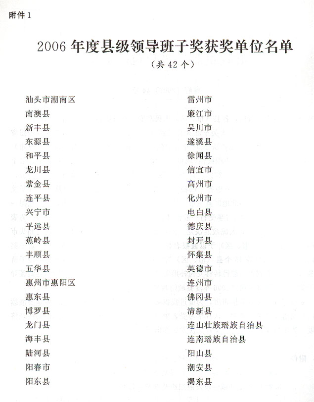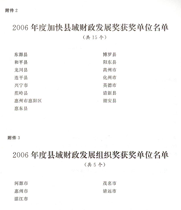 各地級(jí)以上市人民政府,各縣(市、區(qū))人民政府,省政府各部門、各直屬機(jī)構(gòu): 為貫徹落實(shí)黨的十六大關(guān)于壯大縣域經(jīng)濟(jì)、全面建設(shè)小康社會(huì)的精神,按照省委、省政府統(tǒng)一部署,我省從2004年起實(shí)施激勵(lì)型財(cái)政機(jī)制,充分調(diào)動(dòng)了縣(市)發(fā)展經(jīng)濟(jì)、增加財(cái)政收入的積極性,取得顯著成效。2006年,全省地級(jí)以上市、縣上劃省“四稅”平均增長21.27%。其中,粵東、粵西和粵北地區(qū)平均增長21.53%,42個(gè)縣(市、區(qū))獲得上劃省“四稅”超過全省平均水平返還獎(jiǎng)勵(lì)及領(lǐng)導(dǎo)班子獎(jiǎng)勵(lì),占粵東、粵西和粵北地區(qū)縣(市、區(qū))數(shù)的63.64%;53個(gè)縣(市、區(qū))獲得一般性轉(zhuǎn)移支付補(bǔ)助獎(jiǎng)勵(lì),占享受省一般性轉(zhuǎn)移支付補(bǔ)助縣(市、區(qū))數(shù)的79.10%.為表彰先進(jìn),樹立榜樣,省人民政府決定,對(duì)獲得2006年度縣級(jí)領(lǐng)導(dǎo)班子獎(jiǎng)勵(lì)的汕頭市潮南區(qū)等42個(gè)縣(市、區(qū))予以通報(bào)表彰,授予獲得100萬元以上縣級(jí)領(lǐng)導(dǎo)班子獎(jiǎng)勵(lì)的河源市東源縣等15個(gè)縣(市、區(qū))“2006年度加快縣域財(cái)政發(fā)展獎(jiǎng)”;授予所屬縣(市)全部獲得一般性轉(zhuǎn)移支付補(bǔ)助獎(jiǎng)勵(lì)、上劃省“四稅”返還獎(jiǎng)勵(lì)和縣級(jí)領(lǐng)導(dǎo)班子獎(jiǎng)勵(lì)的河源等5市“2006年度縣域財(cái)政發(fā)展組織獎(jiǎng)”。 受表彰的單位要再接再厲,為促進(jìn)我省縣域經(jīng)濟(jì)發(fā)展作出新的貢獻(xiàn)。各地要繼續(xù)全面貫徹落實(shí)科學(xué)發(fā)展觀,認(rèn)真學(xué)習(xí)受表彰單位的經(jīng)驗(yàn)和做法,進(jìn)一步加快縣域經(jīng)濟(jì)發(fā)展,為實(shí)現(xiàn)我省經(jīng)濟(jì)社會(huì)又好又快發(fā)展作出更大貢獻(xiàn)。 附件:1.2006年度縣級(jí)領(lǐng)導(dǎo)班子獎(jiǎng)獲獎(jiǎng)單位名單 2.2006年度加快縣域財(cái)政發(fā)展獎(jiǎng)獲獎(jiǎng)單位名單 3.2006年度縣域財(cái)政發(fā)展組織獎(jiǎng)獲獎(jiǎng)單位名單 廣東省人民政府 二○○七年五月九日