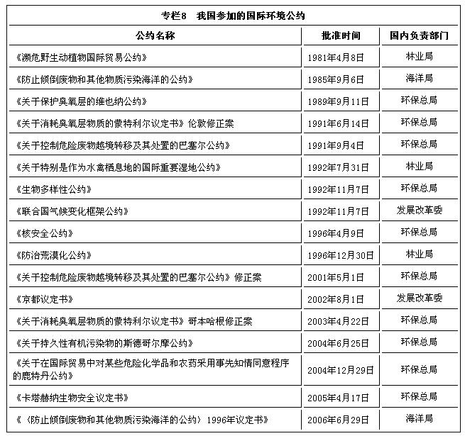 (七)動員社會力量保護環境。 開展各類環境宣傳教育活動,實行環境信息公開,動員社會各界力量參與環境保護。 1.增強全社會生態文明意識。 不斷增強各級干部和廣大群眾的環境意識和法制觀念,重點加強對領導干部的環境教育和培訓。充分發揮輿論引導和監督作用,大力宣傳環境保護的方針政策和法律法規,公開曝光環境違法行為。抓好環保基礎教育、專業教育、社會教育和崗位培訓。全方位、多層次推廣適應建立資源節約型、環境友好型社會要求的生產生活方式。 2.擴大公眾環境知情權。 推行政務公開,實行環境保護政策法規、項目審批、案件處理等政務公告公示制度。完善環境信息政府網站,公開發布環境質量、環境管理等環境信息。依法推進企業環境信息公開,開展上市公司的環境績效評估和環境信息公告。 3.完善公眾參與環境保護機制。 大力普及環境科學知識,實施千鄉萬村環保科普行動計劃。推廣環境標志和環境認證,倡導綠色消費、綠色辦公和綠色采購,廣泛開展綠色社區、綠色學校、綠色家庭等群眾性創建活動,充分發揮工會、共青團、婦聯等群眾組織、社區組織和各類環保社團及環保志愿者的作用。加強信訪工作,充分發揮12369環保熱線的作用,拓寬和暢通群眾舉報投訴渠道。開展環境公益訴訟研究,加強行政復議,推動行政訴訟,依法維護公民環境權益。完善公眾參與的規則和程序,采用聽證會、論證會、社會公示等形式,聽取公眾意見,接受群眾監督,實行民主決策。 (八)積極開展環境保護國際合作。 把環境保護作為我國對外開放的重要領域,繼續擴大對外開放,在國際環境事務中發揮更加積極的作用。 1.積極參與全球環境保護。 堅持“共同但有區別的責任”原則,積極參與國際環境公約和世貿組織環境與貿易談判,維護我國和廣大發展中國家環境權益。履行相應國際義務,大力推進國內履約工作,加快消耗臭氧層物質的淘汰進程,努力控制溫室氣體排放。