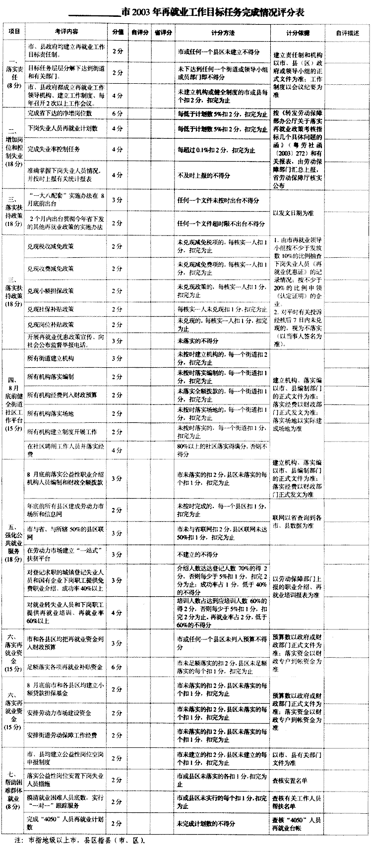 廣東省2003年再就業工作目標責任制考評辦法為進一步貫徹落實《中共廣東省委、廣東省人民政府關于貫徹〈中共中央、國務院關于進一 步做好再就業工作的通知〉的意見》(粵發〔2002〕15號)和廣東省人民政府《關于建立再 就業工作目標責任制的通知》(粵府辦〔2003〕80號),大力推動就業和再就業工作,特制 定本辦法。 一、考評內容 (一)落實再就業工作目標責任制情況; (二)增加就業崗位和控制失業情況; (三)落實就業和再就業政策情況; (四)健全街道社區勞動保障工作平臺情況; (五)強化公共就業服務和再就業培訓情況; (六)加大再就業資金投入情況; (七)幫助困難群體就業情況。 省再就業工作領導小組可根據黨中央、國務院和省委、省政府對新一年的工作部署,于每年 第一季度調整確定當年的考評內容,并予公布。 二、指標和分值 (一)落實責任制(8分) 1.各地級以上市政府,各縣(市、區)政府均建立再就業工作目標責任制,并將年度再就 業工作目標任務逐級下達到街道(鄉鎮)和有關部門(4分)。 2.健全各地級以上市政府,各縣(市、區)政府再就業工作領導機構、工作制度,每年召 開2次以上工作協調會議(4分)。 (二)增加崗位和控制失業(18分) 完成省再就業工作領導小組下達的年度凈增就業崗位數(6分)、下崗失業人員再就業計劃 數(4分)、城鎮登記失業率控制數(4分)、準確掌握下崗失業人員情況,并按時上報有關 統計報表(4分)。 (三)落實再就業政策(18分) 1.各地級以上市政府、市有關部門及時出臺貫徹國家和省委、省政府、省有關部門各項就 業和再就業政策的實施辦法,且要具有結合實際、切實可行、操作性強等特點(5分)。 2.各有關部門能及時兌現下崗失業人員、用人單位和有關服務機構按規定應該享受申請的 各項再就業扶持政策和補貼資金(10分)。 3.開展再就業優惠政策宣傳、向社會公布監督舉報電話(3分)。 (四)健全街道社區勞動保障工作平臺(15分) 2003年8月底前在所有城市街道和工作任務重的鄉鎮建立勞動保障工作機構(3分),做到機 構、人員、經費、場地、制度和工作“六到位”(8分),在街道社區聘請工作人員并落實 工作經費(4分)。 (五)強化公共就業服務和再就業培訓(18分) 1.2003年8月底前,縣以上政府落實公益性職業介紹機構的人員編制和財政撥款經費(3分 );2003年底前,各縣(市、區)均建成勞動力市場場地和信息網絡,各地級以上市 勞動力市場實現與省信息聯網,并與所轄50%的縣(市、區)聯網(5分)。 2.在勞動力市場開設下崗失業登記、職業介紹、職業指導、職業培訓、勞動保障事務代理 、受理享受再就業扶持政策資格認定申請等“一站式”服務(3分)。 3.對登記求職的城鎮登記失業人員和國有企業下崗職工提供免費職業介紹,介紹成功率40% 以上(3分)。 4.對有培訓愿望的城鎮登記就業轉失業人員和國有企業下崗職工提供免費再就業培訓,培 訓后再就業率60%以上(4分)。 (六)加大再就業資金投入(15分) 各地級以上市,各縣(市、區)均把再就業資金納入財政預算(3分),按本市下崗失業人 員再就業人數所需資金安排落實各項補貼資金(6分),建立小額擔保貸款基金(2分),勞 動力市場和信息網絡建設資金(2分),街道(鄉鎮)社區勞動保障工作經費(2分)。 (七)幫助困難群體就業(8分) 1.建立公益性崗位空崗申報制度,落實公益性崗位安置下崗失業人員措施(4分)。 2.建立健全再就業援助制度,摸清就業困難人員底數,完成省下達的“4050”人員再就業 數(4分)。 各項考評內容的評分計算標準和統計方法,見《2003年再就業工作目標落實情況評分表》( 附后)。 三、考評步驟 (一)自評:2004年1月31日前,各地級以上市政府組織對本市2003年再就業工作目 標責任制執行情況進行自評,填寫《評分表》,連同2003年再就業工作總結和自評情況的書 面報告報省再就業工作領導小組辦公室(設在省勞動保障廳)。 (二)核對:省再就業工作領導小組辦公室對各地級以上市自評情況進行核對。核對 有疑點的,有關市應對該項考評內容進行核實,并補充相關證據。 (三)抽查:省再就業工作領導小組組成檢查組,赴各地級以上市,各縣(市、區、 街道)進行實地抽查核實,抽查面應不少于所有地級以上市的40-50%。 (四)評定:省再就業工作領導小組辦公室根據自查、核對和抽查的結果提出初評意 見,提請省再就業工作領導小組全體成員單位會議評定。 四、獎懲辦法 (一)考評分數在90分及以上的為達標市,省政府給予通報表彰,頒發證書并獎勵8萬元。 連續三年達標或明、后兩年評分均在95分以上的,可參加再就業工作先進市評選。 (二)考評分數在70分以下的,省政府給予通報批評。對因工作不力造成嚴重后果的,追究 政府主要領導責任。 (三)對在考評中或考評后核實有弄虛作假行為的市,一律取消其評選資格,省政府給予通 報批評,并追究主要領導責任;已表彰獎勵的,通報撤銷,收回獎金。 (四)對被通報批評或追究領導責任的市,取消其當年參加省政府綜合性評優活動的資格。 五、其他事項 (一)省頒發的獎金由各市政府掌握,用于獎勵再就業工作先進單位、個人和補貼再就業工 作。 (二)省直有關部門再就業工作責任制考評辦法另行制定。 (三)本辦法由省再就業工作領導小組負責解釋。 |