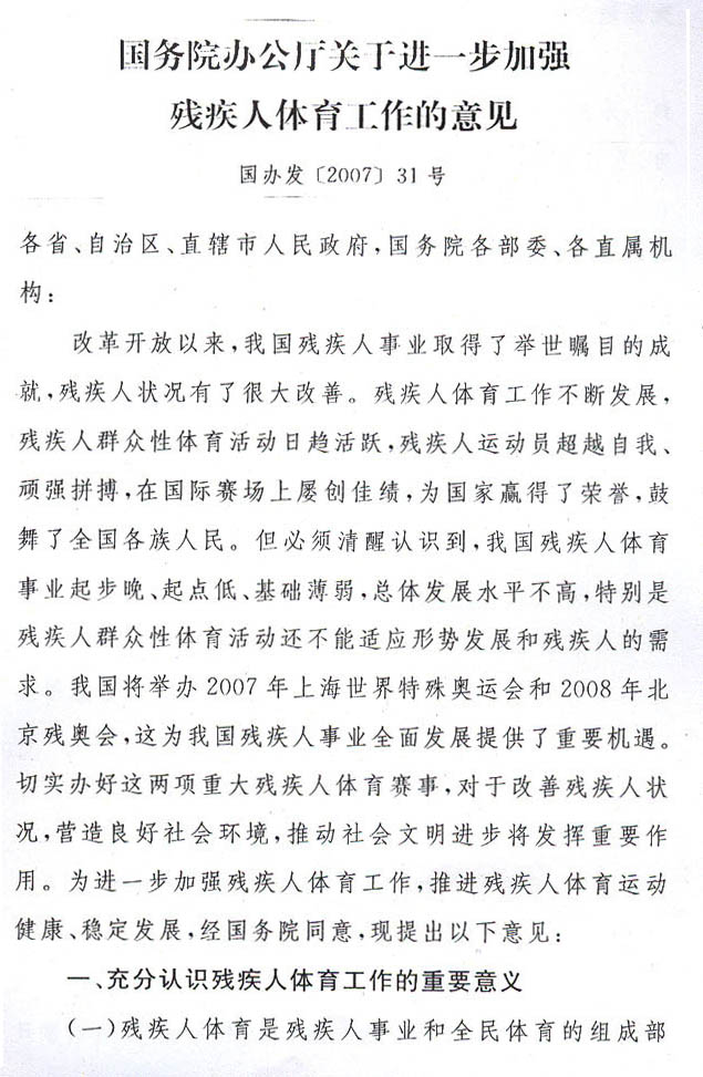 現(xiàn)將《國(guó)務(wù)院辦公廳關(guān)于進(jìn)一步加強(qiáng)殘疾人體育工作的意見(jiàn)》(國(guó)辦發(fā)〔2007〕31號(hào))轉(zhuǎn)發(fā)給你們,請(qǐng)認(rèn)真貫徹執(zhí)行。