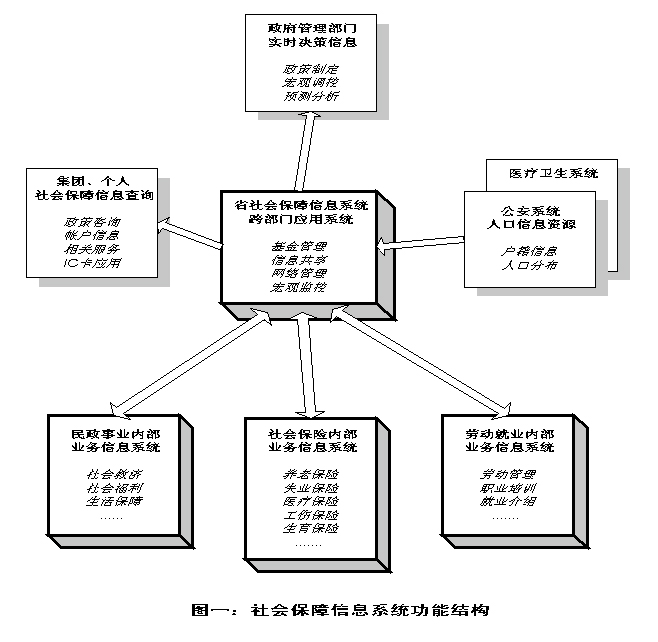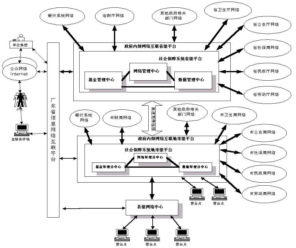 ?。ㄋ模┫到y網絡結構 社會保障信息系統的網絡以我省建立的全省統一網絡互聯大平臺為基礎,在 省、市級分別以政府信息網絡平臺為核心,通過公共通信設施連接到各有關部門。 在公共服務方面,充分利用各個公眾信息網絡和INTERNET資源。網絡結 構如圖四所示。 |