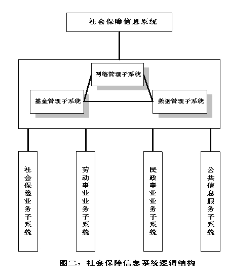 ?。ǘ┫到y邏輯結構 社會保障信息系統在縱向上有省、地市和縣三級,橫向上在省、地市級是以 基金管理子系統、網絡管理子系統、數據管理子系統為核心,并與三大業務系統 相連接。另外,還有面向社會公共信息服務子系統。在縣級重點是建設各個業務 子系統,并通過網絡中心與地市級連接。系統的邏輯結構如圖二所示。 |