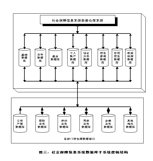 (三)系統數據倉庫 社會保障信息系統數據倉庫是一個統一的、綜合的、分布式的大型數據倉庫, 它主要包括基礎數據庫、社會保障業務數據庫、基金數據庫、個人帳戶數據庫、 綜合分析數據庫、查詢數據庫、宏觀數據庫、政策法規等八大數據庫系統。數據 倉庫系統構成如圖三所示。 |