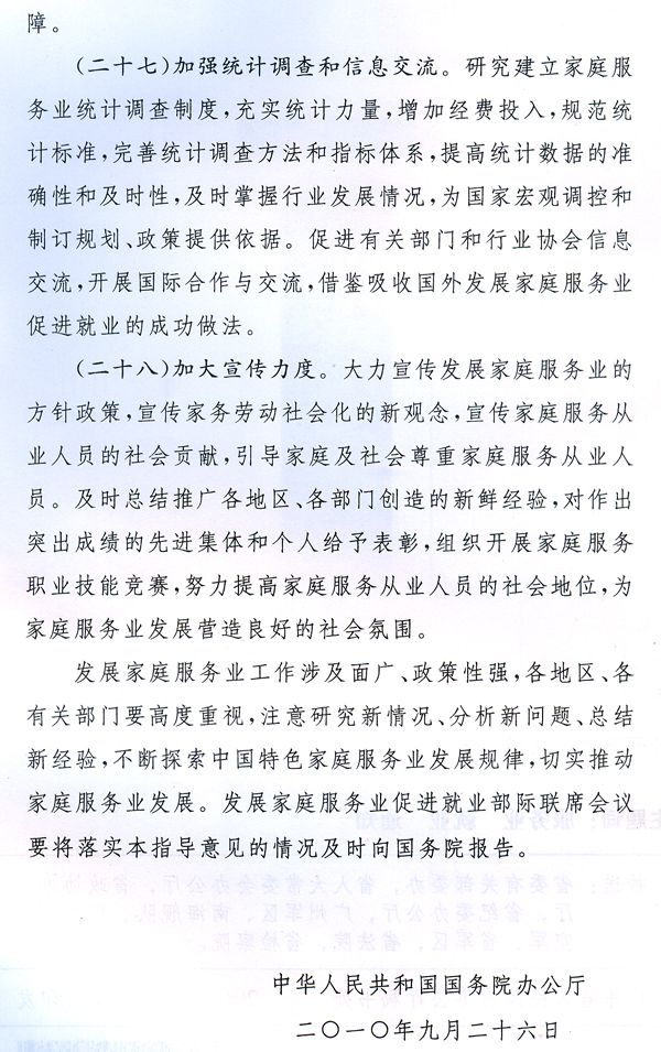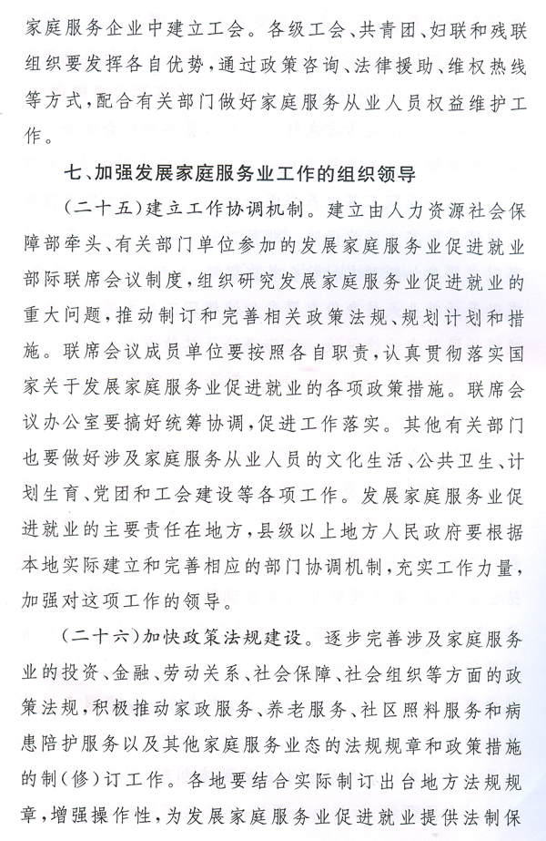 為加強對全省發展家庭服務業工作的組織領導,完善工作協調機制,省人民政府同意建立由省人力資源社會保障廳牽頭,有關部門和單位參加的省發展家庭服務業促進就業部門間聯席會議制度,負責對全省發展家庭服務業工作進行統籌協調和督促指導。各地也要抓緊建立相應的協調機制,并將有關情況及時向省聯席會議報告。