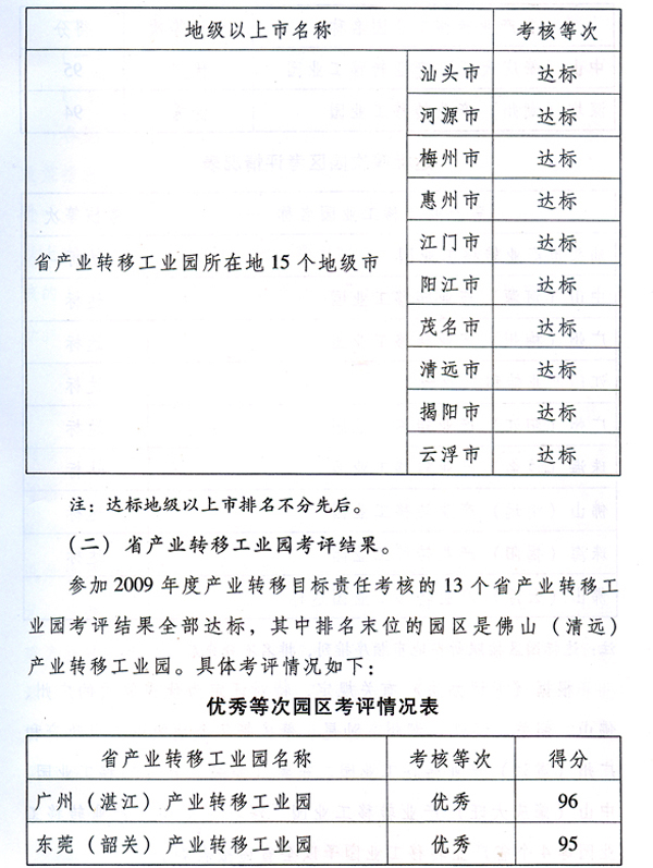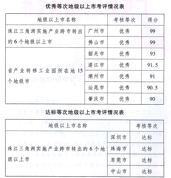 各地級以上市人民政府,省政府各部門、各直屬機構: 為貫徹落實《中共廣東省委廣東省人民政府關于推進產業轉移和勞動力轉移的決定》(粵發〔2008〕4號),加快推進我省產業轉移工作,按照省政府《印發廣東省產業轉移目標責任考核評價辦法的通知》(粵府函〔2010〕132號,以下簡稱《考評辦法》)要求,省經濟和信息化委牽頭會同省雙轉移工作領導小組成員單位,共同組織開展了2009年度產業轉移目標責任考核評價工作。現將考核評價結果進行通報,并對獲得優秀等次的地級以上市政府和省產業轉移工業園予以表彰。 一、產業轉移目標責任考核評價結果 (一)各地級以上市政府考評結果。 全省21個地級以上市2009年度產業轉移目標責任考核結果全部達標,具體考評情況如下: