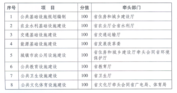 印發(fā)廣東省公共基礎(chǔ)設(shè)施建設(shè) 考核辦法(試行)的通知 ? 各地級(jí)以上市人民政府,各縣(市、區(qū))人民政府,省政府各部門、各直屬機(jī)構(gòu): 《廣東省公共基礎(chǔ)設(shè)施建設(shè)考核辦法(試行)》業(yè)經(jīng)省人民政府同意,現(xiàn)印發(fā)給你們,請(qǐng)認(rèn)真貫徹執(zhí)行。 ? ? 廣東省人民政府辦公廳 二〇一一年一月二十日 ? ? ? ? ? 廣東省公共基礎(chǔ)設(shè)施建設(shè)考核辦法 (試行) ? 為加強(qiáng)全省公共基礎(chǔ)設(shè)施建設(shè)考核工作,確保省委省政府有關(guān)決策部署落到實(shí)處,特制訂本考核辦法。 一、考核對(duì)象和內(nèi)容 (一)考核對(duì)象為各市、縣政府。 ?。ǘ┛己藘?nèi)容為各市、縣政府落實(shí)《珠江三角洲地區(qū)改革發(fā)展規(guī)劃綱要(2008-2020年)》、《中共廣東省委廣東省人民政府關(guān)于促進(jìn)粵東地區(qū)實(shí)現(xiàn)“五年大變化”的指導(dǎo)意見》(粵發(fā)〔2009〕14號(hào))、《中共廣東省委廣東省人民政府關(guān)于促進(jìn)粵西地區(qū)振興發(fā)展的指導(dǎo)意見》(粵發(fā)〔2009〕15號(hào))、《中共廣東省委廣東省人民政府關(guān)于促進(jìn)粵北山區(qū)跨越式發(fā)展的指導(dǎo)意見》(粵發(fā)〔2010〕5號(hào))、《印發(fā)廣東省基本公共服務(wù)均等化規(guī)劃綱要(2009-2020年)的通知》(粵府〔2010〕153號(hào))等文件提出的公共基礎(chǔ)設(shè)施建設(shè)目標(biāo)任務(wù)和分階段工作任務(wù),重點(diǎn)考核編制公共基礎(chǔ)設(shè)施規(guī)劃,建設(shè)農(nóng)業(yè)、水利、交通、能源等基礎(chǔ)設(shè)施,城鎮(zhèn)市政公用設(shè)施,公共教育、衛(wèi)生、文化、體育設(shè)施等方面工作目標(biāo)和任務(wù)的年度完成情況。 二、考核指標(biāo)和分值 考核指標(biāo)分為公共基礎(chǔ)設(shè)施規(guī)劃編制、農(nóng)業(yè)基礎(chǔ)設(shè)施、水利基礎(chǔ)設(shè)施(含農(nóng)田水利設(shè)施)、交通基礎(chǔ)設(shè)施、能源基礎(chǔ)設(shè)施、城鎮(zhèn)市政公用設(shè)施、公共教育設(shè)施、公共衛(wèi)生設(shè)施、公共文化體育設(shè)施等九項(xiàng)指標(biāo)(見下表),由表中各牽頭部門會(huì)同相關(guān)部門分別負(fù)責(zé)。