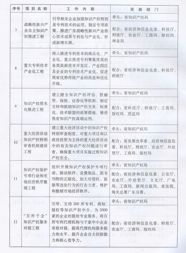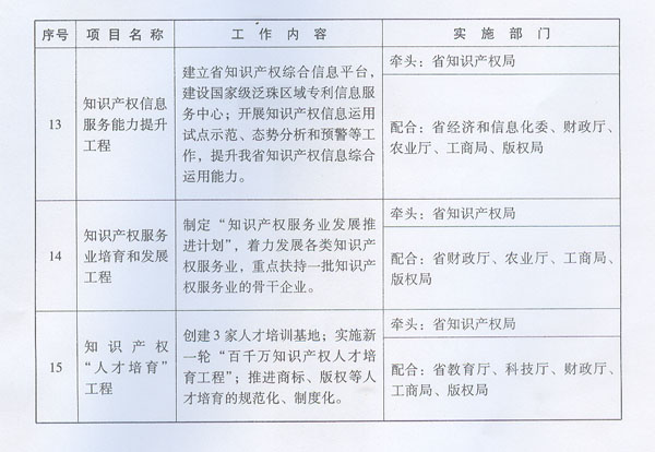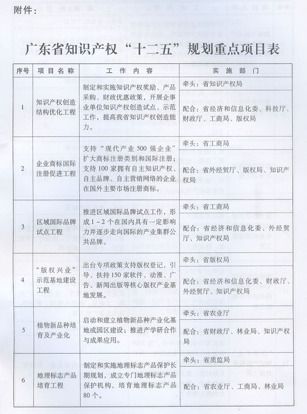 印發(fā)廣東省知識產(chǎn)權事業(yè)發(fā)展 “十二五”規(guī)劃的通知 ? 各地級以上市人民政府,各縣(市、區(qū))人民政府,省政府各部門、各直屬機構: 《廣東省知識產(chǎn)權事業(yè)發(fā)展“十二五”規(guī)劃》已經(jīng)省人民政府同意,現(xiàn)印發(fā)給你們,請認真貫徹執(zhí)行。執(zhí)行中遇到的問題,請徑向省知識產(chǎn)權局反映。 ? ? ? ? 廣東省人民政府辦公廳 二○一一年八月十日 ? ? ? ? 廣東省知識產(chǎn)權事業(yè)發(fā)展 “十二五”規(guī)劃 ? 目 錄 ? 一、發(fā)展基礎與形勢……………………………………………………………(1) (一)發(fā)展基礎 ………………………………………………………………(1) 1.確立了知識產(chǎn)權強省建設目標………………………………………………(1) 2.制定了實施知識產(chǎn)權戰(zhàn)略綱要………………………………………………(1) 3.知識產(chǎn)權政策法規(guī)體系不斷完善……………………………………………(2) 4.知識產(chǎn)權數(shù)量和質(zhì)量躍上新臺階……………………………………………(2) 5.知識產(chǎn)權運用能力持續(xù)增強…………………………………………………(3) 6.知識產(chǎn)權保護力度不斷加大…………………………………………………(3) 7.知識產(chǎn)權管理水平和服務能力不斷提高……………………………………(4) (二)發(fā)展形勢 ………………………………………………………………(5) 1.國際形勢………………………………………………………………………(5) 2.國內(nèi)形勢………………………………………………………………………(5) (三)面臨的挑戰(zhàn) ……………………………………………………………(6) 1.體制與機制改革有待進一步深化……………………………………………(6) 2.知識產(chǎn)權創(chuàng)造能力亟需全面提高……………………………………………(6) 3.知識產(chǎn)權轉(zhuǎn)化運用亟待著力推進……………………………………………(6) 4.知識產(chǎn)權結構和區(qū)域發(fā)展不平衡……………………………………………(7) 二、指導思想和發(fā)展目標 ?…………………………………………………(7) (一)指導思想 ………………………………………………………………(7) (二)發(fā)展目標 ………………………………………………………………(8) 三、主要任務……………………………………………………………………(9) (一)激勵知識產(chǎn)權創(chuàng)造,全面增強自主創(chuàng)新能力 ………………………(10) 1.完善自主創(chuàng)新激勵機制………………………………………………………(10) 2.突顯企業(yè)主體地位和作用……………………………………………………(10) 3.提高產(chǎn)業(yè)自主創(chuàng)新能力………………………………………………………(10) 4.提升高校與科研機構創(chuàng)造能力………………………………………………(11) (二)促進知識產(chǎn)權運用,引領建立現(xiàn)代產(chǎn)業(yè)體系 ………………………(11) 1.著力推動產(chǎn)業(yè)結構優(yōu)化升級…………………………………………………(11) 2.加快推進知識產(chǎn)權轉(zhuǎn)化和運用………………………………………………(12) 3.積極推進專利技術標準化工作………………………………………………(12) 4.培育具有核心競爭力的知名品牌……………………………………………(13) 5.大力實施“版權興業(yè)工程”…………………………………………………(13) 6.積極促進植物新品種應用……………………………………………………(13) 7.推進傳統(tǒng)知識產(chǎn)權化與產(chǎn)業(yè)化………………………………………………(13) (三)加強知識產(chǎn)權保護,維護公平競爭市場秩序 ………………………(14) 1.健全知識產(chǎn)權保護機制………………………………………………………(14) 2.加大知識產(chǎn)權行政執(zhí)法力度…………………………………………………(14) 3.加強知識產(chǎn)權刑事執(zhí)法工作…………………………………………………(15) 4.提升知識產(chǎn)權司法審判水平…………………………………………………(15) 5.強化會展和行業(yè)協(xié)會知識產(chǎn)權保護…………………………………………(15) 6.加強地理標志產(chǎn)品保護工作…………………………………………………(16) 7.建立維權援助和涉外應對機制………………………………………………(16) (四)優(yōu)化知識產(chǎn)權管理,營造良好的發(fā)展環(huán)境 …………………………(16) 1.健全知識產(chǎn)權管理體制………………………………………………………(16) 2.推行知識產(chǎn)權特別審查制度…………………………………………………(17) 3.推進企業(yè)知識產(chǎn)權規(guī)范管理…………………………………………………(17) 4.加強代理機構與人員管理……………………………………………………(17) 5.強化生物物種遺傳資源管理…………………………………………………(17) 6.加強知識產(chǎn)權對外交流與合作………………………………………………(17) (五)強化知識產(chǎn)權服務,促進創(chuàng)新型廣東建設 ……………