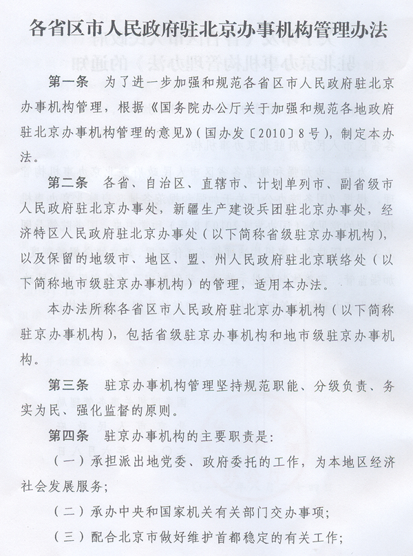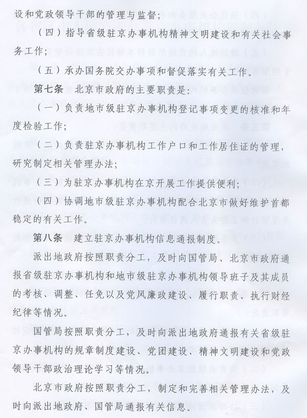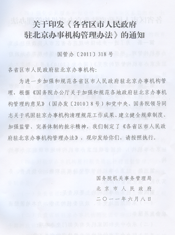 ? 轉發國務院機關事務管理局北京市人民政府 關于印發各省區市人民政府駐北京 辦事機構管理辦法的通知 ? 各地級以上市人民政府,順德區人民政府,省直有關單位: 經省人民政府同意,現將國務院機關事務管理局、北京市人民政府《關于印發〈各省區市人民政府駐北京辦事機構管理辦法〉的通知》(國管辦〔2011〕318號,以下簡稱《管理辦法》)轉發給你們,結合我省實際提出如下意見,請一并貫徹執行。 一、我省各駐京辦事機構要認真貫徹落實《管理辦法》的各項工作要求,切實做到規范職能、廉潔從政、務實為民,不斷強化公共服務和社會管理職能。要建立重要事項報告制度,健全黨的各級組織和管理制度,完善財務和資產管理制度,嚴格執行黨政機關公務接待管理規定。要加強與國務院機關事務管理局、北京市人民政府的溝通協調,努力在推動地區間協作、服務本地區經濟社會發展、處置突發事件、維護首都穩定等方面發揮更加積極有效的作用。 二、設有駐京辦事機構的地級以上市人民政府和順德區人民政府,要切實履行監督管理職責,按照《管理辦法》的要求,研究制訂并組織實施加強和規范本地區駐京辦事機構管理的制度辦法,制訂和落實駐京辦事機構“三定”方案,嚴格執行黨風廉政建設責任制,加強駐京辦事機構人事、預算、財務和資產管理,按規定開展相關審計工作。要及時向國務院機關事務管理局、北京市人民政府和省政府駐京辦通報駐京辦事機構人事工作、履行職責、黨風廉政建設等方面的情況。省政府辦公廳將另行制訂加強和規范駐京辦事機構管理的制度辦法。 三、省駐京辦要切實加強對我省各駐京辦事機構的指導、協調、監督,統籌全省在京資源,形成工作合力;要按照《關于同意成立中共廣東省駐北京機構委員會的批復》(粵組黨〔2010〕14號)的要求,抓緊推進中共廣東省駐北京機構委員會組建工作。各駐京辦事機構要加強與省駐京辦的溝通聯系,及時將處置突發事件、信訪維穩及廉政建設等方面的情況報送省駐京辦,并積極配合省駐京辦做好相關工作。 ? ? ? ? 廣東省人民政府辦公廳 二○一一年八月二十四日 ? ? ? ?