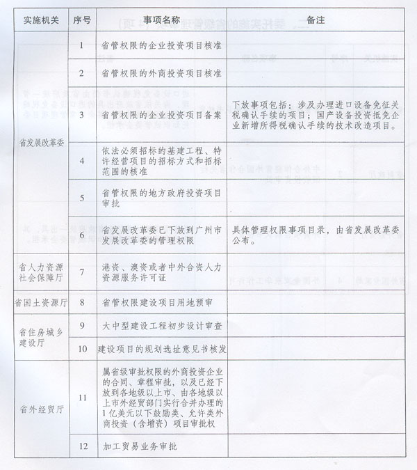 《廣東省第一批調(diào)整由中新廣州知識(shí)城管理委員會(huì)實(shí)施的省級(jí)管理權(quán)限事項(xiàng)目錄》已經(jīng)2011年8月2日廣東省人民政府第十一屆77次常務(wù)會(huì)議通過,現(xiàn)予公布,自公布之日起施行。