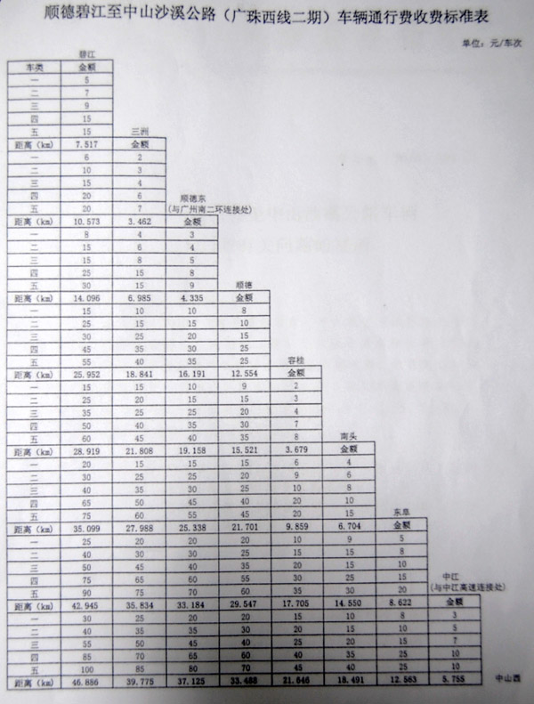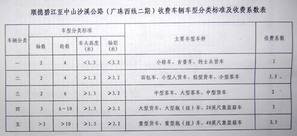 省交通運輸廳、物價局: 粵交費〔2010〕358號請示收悉。省人民政府同意順德碧江至中山沙溪公路(廣珠西線二期)交工驗收通車和收費站收費設施經驗收符合省聯網收費技術要求后開始收費,收費車型按全省高速公路統一標準,即按車輛軸(輪)數及車頭高度等物理參數進行分類,一至五類車收費系數分別是1、1.5、2、3、3.5;收費標準為0.6元/標準車公里。 ? 附件:1.順德碧江至中山沙溪公路(廣珠西線二期)收費車輛車型分類標準及收費系數表 2.順德碧江至中山沙溪公路(廣珠西線二期)車輛通行費收費標準表