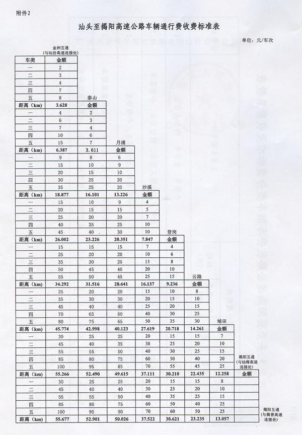 省交通運輸廳、物價局: 粵交費〔2011〕1351號請示收悉。省人民政府同意汕頭至揭陽高速公路外砂至庵埠段交工驗收通車和收費站收費設施經驗收符合省聯網收費技術要求后開始收費,汕頭至揭陽高速公路全線收費車型按全省高速公路統一標準,即按車輛軸(輪)數及車頭高度等物理參數進行分類,一至五類車的收費系數分別為1、15、2、3、35;月浦至揭東段收費標準為0.45元/標準車公里,外砂至月浦段、揭東至新亨段收費標準為0.6元/標準車公里。 ? 附件:1.汕頭至揭陽高速公路收費車輛車型分類標準及收費系數表 2.汕頭至揭陽高速公路車輛通行費收費標準表 ? 廣東省人民政府辦公廳 二○一一年十二月九日 ?