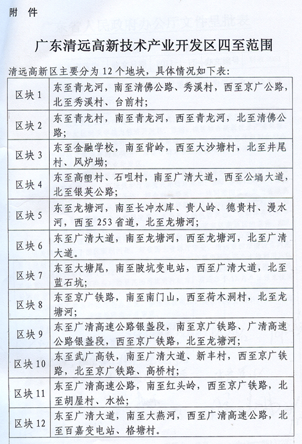 清遠(yuǎn)市人民政府: 清府〔2011〕6號(hào)文收悉。經(jīng)省人民政府同意,現(xiàn)函復(fù)如下: 一、省人民政府同意認(rèn)定廣東清遠(yuǎn)經(jīng)濟(jì)技術(shù)開發(fā)區(qū)為省級(jí)高新技術(shù)產(chǎn)業(yè)開發(fā)區(qū),定名為廣東清遠(yuǎn)高新技術(shù)產(chǎn)業(yè)開發(fā)區(qū),實(shí)行現(xiàn)行省級(jí)高新技術(shù)產(chǎn)業(yè)開發(fā)區(qū)政策。 二、廣東清遠(yuǎn)高新技術(shù)產(chǎn)業(yè)開發(fā)區(qū)不增加規(guī)劃面積,仍為19.1274平方公里,區(qū)域范圍為國(guó)家有關(guān)部門公布的開發(fā)區(qū)審核公告確定的清遠(yuǎn)經(jīng)濟(jì)技術(shù)開發(fā)區(qū)四至范圍內(nèi)(具體四至范圍見附件)。 三、廣東清遠(yuǎn)高新技術(shù)產(chǎn)業(yè)開發(fā)區(qū)必須嚴(yán)格實(shí)施土地利用總體規(guī)劃和城市總體規(guī)劃,按規(guī)定履行具體土地報(bào)批手續(xù),依法供地,切實(shí)做到合理、集約、高效利用土地資源。 四、廣東清遠(yuǎn)高新技術(shù)產(chǎn)業(yè)開發(fā)區(qū)要以科學(xué)發(fā)展觀為指導(dǎo),努力集聚自主創(chuàng)新資源,提升產(chǎn)業(yè)競(jìng)爭(zhēng)力和自主創(chuàng)新能力,發(fā)展高新技術(shù)產(chǎn)業(yè)和高附加值服務(wù),充分發(fā)揮輻射和示范帶動(dòng)作用。 五、你市要加強(qiáng)指導(dǎo)和服務(wù),促進(jìn)廣東清遠(yuǎn)高新技術(shù)產(chǎn)業(yè)開發(fā)區(qū)健康發(fā)展。 ? 附件:廣東清遠(yuǎn)高新技術(shù)產(chǎn)業(yè)開發(fā)區(qū)四至范圍 ? 廣東省人民政府辦公廳 二○一一年十二月三十一日