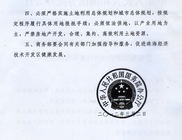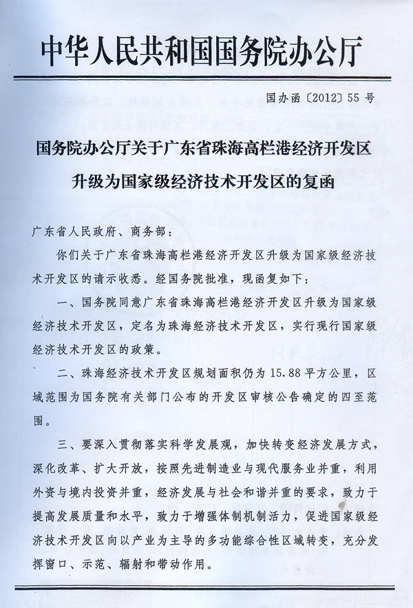 珠海市人民政府: 現將《國務院辦公廳關于廣東省珠海高欄港經濟開發區升級為國家級經濟技術開發區的復函》(國辦函〔2012〕55號) 轉發給你們,請按照辦理。