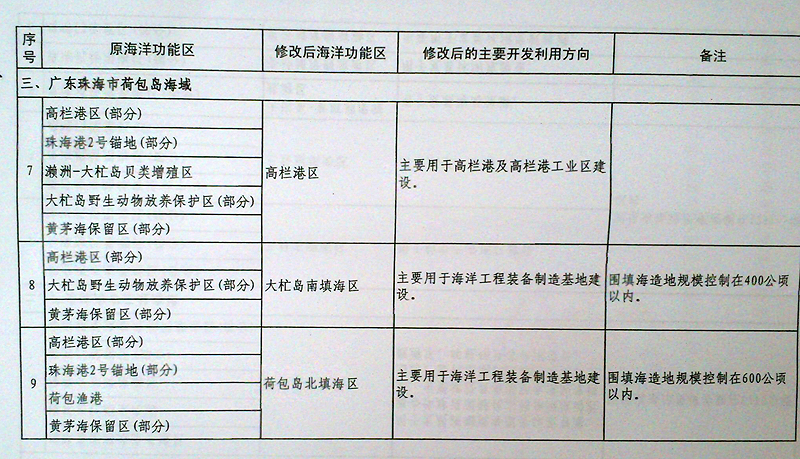 各地級以上市人民政府,各縣(市、區)人民政府,省政府各部門、各直屬機構: 根據國家海洋局《關于同意廣東省海洋功能區劃修改方案的函》(國海管字〔2012〕190號),經國務院同意,對《廣東省海洋功能區劃》(文本見粵府〔2008〕57號文)作出如下修改:將珠海市橫琴新區、三灶、荷包島3個海域的原16個功能區調整為9個功能區(修改方案見附件),其中“橫琴南填海區”圍填海造地規??刂圃?790公頃以內,“三灶東填海區”和“三灶南填海區”兩個功能區圍填海造地規??刂圃?291公頃以內,“大杧島南填海區”圍填海造地規??刂圃?00公頃以內,“荷包島北填海區”圍填海造地規??刂圃?00公頃以內。《廣東省海洋功能區劃》其他內容保持不變。各有關地區、有關部門要嚴格執行海洋功能區劃制度,按照修改后的功能區劃,落實海域使用管理和海洋環境保護要求。