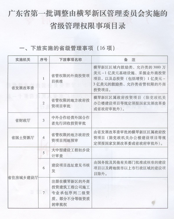 | 名稱: | 廣東省第一批調整由橫琴新區管理委員會實施的省級管理權限事項目錄 | ||