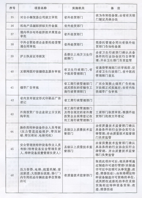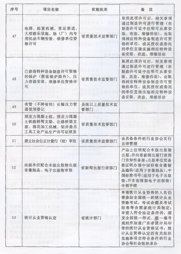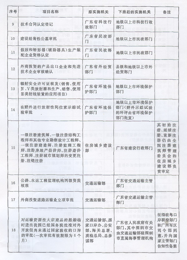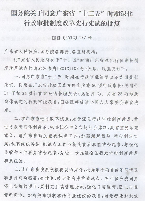 ? 廣東省人民政府轉(zhuǎn)發(fā)《國(guó)務(wù)院關(guān)于同意 廣東省“十二五”時(shí)期深化行政審批 制度改革先行先試的批復(fù)》的通知 ? 各地級(jí)以上市人民政府,各縣(市、區(qū))人民政府,省政府各部門、各直屬機(jī)構(gòu): 現(xiàn)將《國(guó)務(wù)院關(guān)于同意廣東省“十二五”時(shí)期深化行政審批制度改革先行先試的批復(fù)》(國(guó)函〔2012〕177號(hào))轉(zhuǎn)給你們,并結(jié)合我省實(shí)際提出以下意見,請(qǐng)一并認(rèn)真貫徹執(zhí)行。 一、積極穩(wěn)妥做好實(shí)施工作 各地、各部門要結(jié)合當(dāng)前正在推進(jìn)的各級(jí)行政審批制度改革工作,抓緊制訂具體實(shí)施方案,明確實(shí)施時(shí)間、任務(wù)和進(jìn)度安排等,確保行政審批項(xiàng)目取消和調(diào)整工作及時(shí)落實(shí)到位。 (一)關(guān)于國(guó)務(wù)院同意在我省行政區(qū)域內(nèi)停止實(shí)施的行政審批事項(xiàng)。 對(duì)國(guó)務(wù)院同意在我省行政區(qū)域內(nèi)停止實(shí)施的行政審批事項(xiàng),原實(shí)施機(jī)關(guān)自本通知下發(fā)之日起停止實(shí)施,不得變相審批。 對(duì)國(guó)務(wù)院同意在我省行政區(qū)域內(nèi)政府部門不再實(shí)施、轉(zhuǎn)移給具備條件的行業(yè)組織實(shí)行自律管理的事項(xiàng),要根據(jù)國(guó)函〔2012〕177號(hào)文規(guī)定的具體內(nèi)容,結(jié)合省編委《政府向社會(huì)轉(zhuǎn)移職能工作方案》(粵機(jī)編〔2012〕22號(hào))有關(guān)要求,分類分步轉(zhuǎn)移,積極穩(wěn)妥有序推進(jìn),確保相關(guān)事項(xiàng)“轉(zhuǎn)得出、接得穩(wěn)”。已經(jīng)具備條件的事項(xiàng),要立即實(shí)施轉(zhuǎn)移;基本具備條件的事項(xiàng),要制訂分步驟分階段工作安排,逐步實(shí)施轉(zhuǎn)移;暫不具備條件的事項(xiàng),要加快培育行業(yè)組織,設(shè)定一定過渡期并明確過渡期內(nèi)的管理安排。各部門要就每項(xiàng)轉(zhuǎn)移事項(xiàng)制訂實(shí)施方案,報(bào)本級(jí)機(jī)構(gòu)編制部門或行政審批制度改革牽頭部門審定。除需新成立行業(yè)組織后再實(shí)施轉(zhuǎn)移的事項(xiàng)外,其他轉(zhuǎn)移事項(xiàng)的交接工作爭(zhēng)取在2013年上半年基本完成。 (二)關(guān)于國(guó)務(wù)院同意下放管理層級(jí)的行政審批事項(xiàng)。 由國(guó)家部門下放到我省實(shí)施的行政審批事項(xiàng),各地、各部門要積極主動(dòng)與國(guó)家有關(guān)部門做好溝通銜接,爭(zhēng)取在2012年年底前完成交接工作,并在國(guó)家相關(guān)部門的指導(dǎo)下,依法開展行政審批。 對(duì)國(guó)務(wù)院同意我省下放到市、縣實(shí)施的行政審批事項(xiàng),原實(shí)施機(jī)關(guān)要在2012年年底前與承接單位完成交接工作,并通過有效方式向社會(huì)公布交接日期、下放事項(xiàng)及權(quán)責(zé)關(guān)系等。在交接期間,原實(shí)施機(jī)關(guān)要繼續(xù)做好相關(guān)管理工作,防止交接過程中出現(xiàn)管理“真空”。原實(shí)施機(jī)關(guān)要加強(qiáng)對(duì)承接單位的業(yè)務(wù)培訓(xùn)和指導(dǎo),促進(jìn)承接單位依法依規(guī)有序開展工作。行政審批事項(xiàng)下放后,實(shí)施機(jī)關(guān)為市、縣(市、區(qū))人民政府的,由市、縣(市、區(qū))人民政府確定具體實(shí)施部門。除另有規(guī)定外,佛山市順德區(qū)政府(部門)享有下放給地級(jí)以上市政府(部門)的權(quán)限。 二、切實(shí)加強(qiáng)監(jiān)管 在取消、調(diào)整行政審批事項(xiàng)的同時(shí),要努力改變重審批、輕監(jiān)管的管理方式,加快推動(dòng)政府部門工作重心向制訂標(biāo)準(zhǔn)規(guī)則和強(qiáng)化監(jiān)管轉(zhuǎn)移,管理方式由事前審批向事中、事后監(jiān)管轉(zhuǎn)變。各部門要根據(jù)省編委《關(guān)于加強(qiáng)對(duì)行政審批制度改革調(diào)整事項(xiàng)監(jiān)管的意見》(粵機(jī)編〔2012〕23號(hào))有關(guān)要求,結(jié)合社會(huì)信用體系建設(shè)和市場(chǎng)監(jiān)管體系建設(shè),針對(duì)取消、調(diào)整的行政審批事項(xiàng),逐項(xiàng)制訂具體監(jiān)管辦法,切實(shí)履行好后續(xù)監(jiān)管職責(zé),抓緊完善各領(lǐng)域、各環(huán)節(jié)的監(jiān)管制度和管理規(guī)范,強(qiáng)化監(jiān)管責(zé)任,落實(shí)監(jiān)管措施,防止監(jiān)管缺位。 三、加快培育發(fā)展和規(guī)范社會(huì)組織 按照省委、省政府《關(guān)于進(jìn)一步培育發(fā)展和規(guī)范管理社會(huì)組織的方案》(粵發(fā)〔2012〕7號(hào))有關(guān)要求,積極推進(jìn)社會(huì)組織去行政化和去壟斷化,加大對(duì)社會(huì)組織發(fā)展扶持力度,擴(kuò)大政府購(gòu)買服務(wù),鼓勵(lì)和引導(dǎo)社會(huì)組織更多地參與社會(huì)服務(wù)和社會(huì)管理事務(wù),促進(jìn)社會(huì)組織良性有序發(fā)展。加快構(gòu)建社會(huì)組織綜合監(jiān)管體系,建立健全社會(huì)組織服務(wù)管理能力評(píng)估辦法,引導(dǎo)社會(huì)組織建立健全規(guī)范運(yùn)作、誠(chéng)信執(zhí)業(yè)、信息公開、公平競(jìng)爭(zhēng)、獎(jiǎng)勵(lì)懲戒、自律保障等機(jī)制。 四、推進(jìn)行政審批標(biāo)準(zhǔn)化規(guī)范化建設(shè) 加快出臺(tái)《
