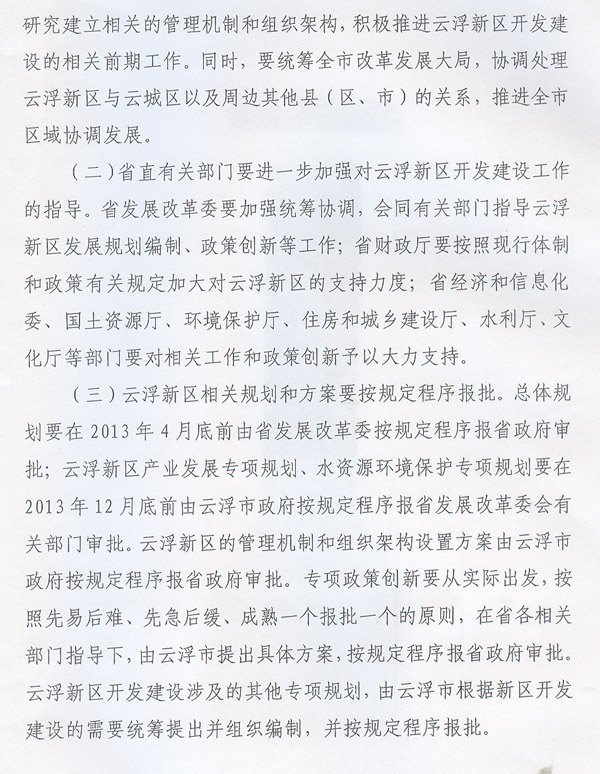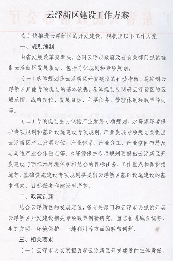 廣東省人民政府辦公廳關于印發云浮新區 建設工作方案的通知? 經省人民政府同意,現將《云浮新區建設工作方案》印發給你們,請認真貫徹執行。? ? ? ? 省府辦公廳 2013年3月1日