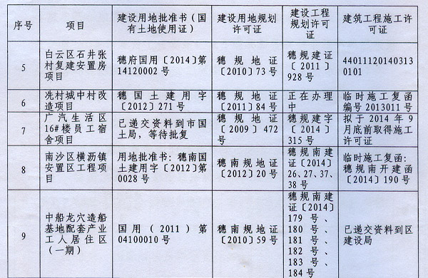 1.廣州市相關(guān)項(xiàng)目。目前,集賢莊公共租賃住房項(xiàng)目和白云區(qū)石井張村復(fù)建安置房項(xiàng)目已取得國(guó)有土地使用證、建設(shè)用地規(guī)劃許可證、建設(shè)工程規(guī)劃許可證和施工許可證,其余項(xiàng)目正按計(jì)劃抓緊完善報(bào)建手續(xù)。各項(xiàng)目的手續(xù)辦理情況見(jiàn)下表: