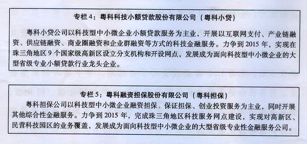 (二)引導(dǎo)發(fā)展科技信貸。(省科技廳牽頭,省財政廳、金融辦及珠三角九市政府等參與) ——強(qiáng)化廣州、深圳、東莞、佛山市科技和金融結(jié)合試點(diǎn)的輻射帶動作用,促進(jìn)各市發(fā)展新型科技金融機(jī)構(gòu);鼓勵各市設(shè)立政府科技貸款風(fēng)險補(bǔ)償金和科技貸款貼息資金,引導(dǎo)各類金融機(jī)構(gòu)創(chuàng)新科技型企業(yè)貸款模式、產(chǎn)品和服務(wù)。支持粵科科技小額貸款公司、粵科融資擔(dān)保公司(專欄4、5)在珠三角高新區(qū)、專業(yè)鎮(zhèn)與當(dāng)?shù)卣献髟O(shè)立子公司、分支機(jī)構(gòu),吸引社會資本,搭建覆蓋高新區(qū)和專業(yè)鎮(zhèn)的業(yè)務(wù)網(wǎng)絡(luò)平臺。積極開展知識產(chǎn)權(quán)投融資服務(wù),推動科技保險產(chǎn)品創(chuàng)新和科技擔(dān)保業(yè)務(wù)發(fā)展,提高科技信貸水平,形成科技金融產(chǎn)業(yè)發(fā)展新格局。