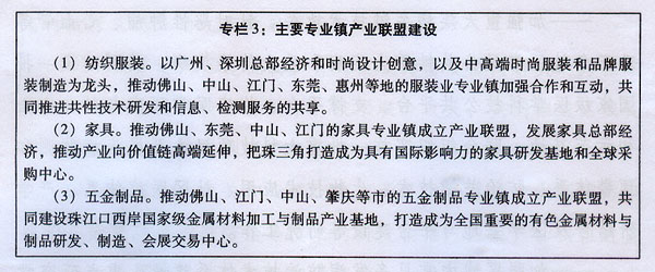 (三)推動專業(yè)鎮(zhèn)協(xié)同升級。(省科技廳牽頭,省經(jīng)濟(jì)和信息化委及珠三角九市政府等參與) ——發(fā)展專業(yè)鎮(zhèn)產(chǎn)業(yè)聯(lián)盟。支持各市專業(yè)鎮(zhèn)在家具、家電、紡織服裝等特色優(yōu)勢產(chǎn)業(yè)重要環(huán)節(jié)加強(qiáng)合作與交流,促進(jìn)專業(yè)分工和產(chǎn)業(yè)鏈延伸,形成專業(yè)鎮(zhèn)產(chǎn)業(yè)發(fā)展聯(lián)盟(專欄3)。