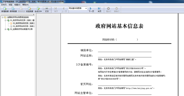 (二)填報政府網站和欄目(系統)基本信息。 填報單位運行客戶端軟件,打開“政府網站和欄目(系統)基本信息表”并新建數據,填寫政府網站和欄目(系統)基本信息并保存。表單所有信息項均為必填項,如確無內容請填寫“無”。 填寫完成并校驗無誤后,使用“生成文件”功能形成電子版文件,并將該電子版文件報送本級組織單位。