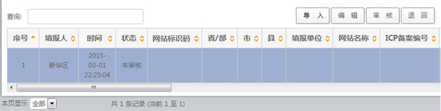 (三)逐級審核。 組織單位在收到上報文件后,使用賬號和密碼登錄報送系統,在“政府網站和欄目(系統)基本信息表”的數據管理頁面中,將上報文件導入系統。