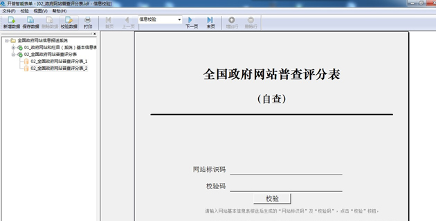 三、檢查整改階段使用說明 (一)填報單位自查。 填報單位打開客戶端軟件,選取“全國政府網站普查評分表”并新建數據,首先輸入“網站標識碼”和“校驗碼”,通過驗證后,填寫該網站的自查評分信息并保存。