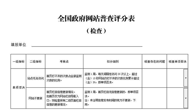 | 一級指標 | 二級指標 | 考察點 | 扣分細則 | 存在的問題 | 扣分 | | 單項否決 | 站點無法訪問 | 首頁打不開的次數占全部監測次數的比例。 | 監測1周,每天間隔性訪問20次以上,超過(含)15秒網站仍打不開的次數比例累計超過(含)5%,即單項否決。 | | — | | 網站不更新 | 首頁欄目信息更新情況。
