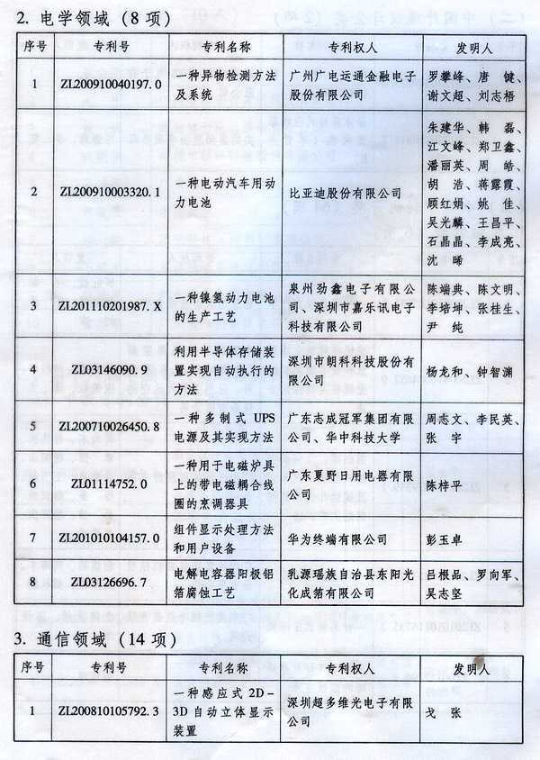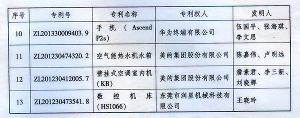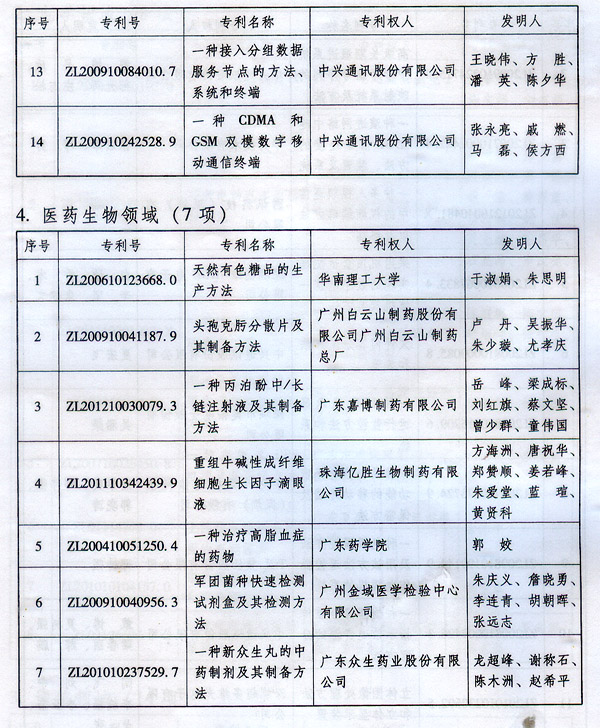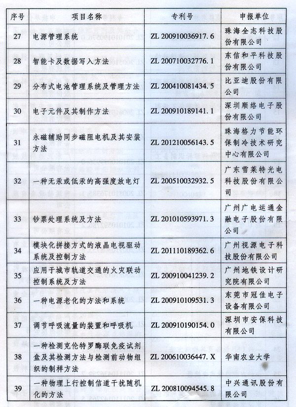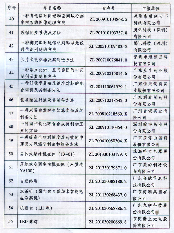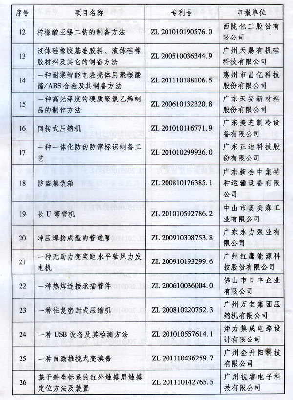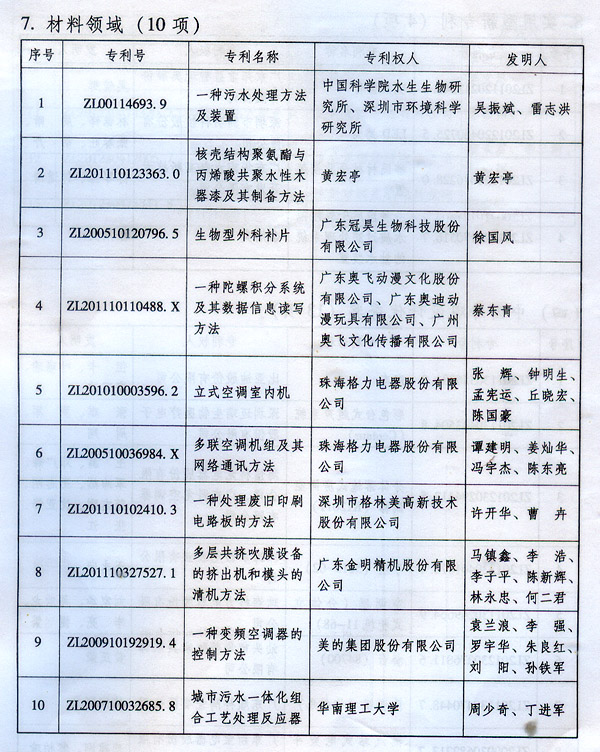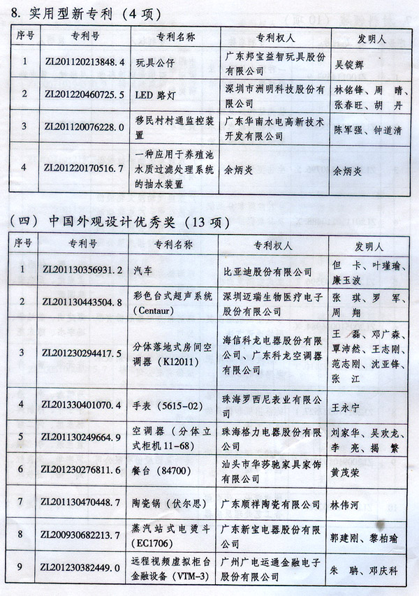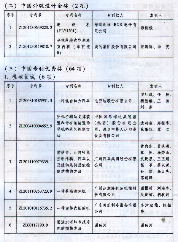 ? 廣東省人民政府關于表彰2014年廣東省 專利獎單位和個人的通報 ? 各地級以上市人民政府,各縣(市、區)人民政府,省政府各部門、各直屬機構: 根據《廣東省專利獎勵辦法》(粵府令第202號規定),經廣東專利獎評審委員會評審,省知識產權局審核,省政府決定授予“一種一元或多元氣凝膠隔熱材料及其制備方法”等15項專利為2014年廣東專利金獎,給予每項10萬元的獎勵;授予“多聯式空調機組的控制方法”等55項專利為2014年廣東專利優秀獎,給予每項5萬元的獎勵;授予瞿金平等10位發明人2014年廣東發明人獎,給予每人2萬元的獎勵;對我省獲得第十六屆中國專利金獎的“基于拉伸流變的高分子材料塑化輸運方法及設備”等4項專利、獲得第十六屆中國外觀設計金獎的“電視機(PLY1201)”等2項專利給予每項100萬元獎勵,對我省獲得第十六屆中國專利優秀獎的“一種混合動力汽車”等64項專利、獲得第十六屆中國外觀設計優秀獎的“汽車”等13項專利給予每項50萬元獎勵。