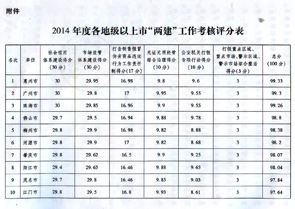 按照省委、省政府關(guān)于加強(qiáng)社會(huì)信用體系建設(shè)和市場監(jiān)管體系建設(shè)(以下簡稱“兩建”)工作部署和《2014年度廣東省社會(huì)信用體系建設(shè)和市場監(jiān)管體系建設(shè)工作考核方案》要求,省“兩建”工作領(lǐng)導(dǎo)小組辦公室牽頭組織省有關(guān)單位對各地級以上市政府“兩建”工作進(jìn)行了考核。經(jīng)綜合評定,21個(gè)地級以上市考核全部合格,其中,惠州、廣州、珠海市成績顯著。經(jīng)省人民政府同意,現(xiàn)將全省“兩建”工作情況通報(bào)如下: