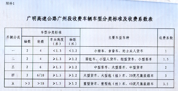 粵交費(fèi)〔2015〕414號(hào)請(qǐng)示收悉。同意廣明高速公路廣州段建成通車(chē)和收費(fèi)站收費(fèi)設(shè)施經(jīng)驗(yàn)收符合省聯(lián)網(wǎng)收費(fèi)技術(shù)要求后開(kāi)始收費(fèi),收費(fèi)車(chē)型按全省高速公路統(tǒng)一標(biāo)準(zhǔn),即按車(chē)輛軸(輪)數(shù)及車(chē)頭高度等物理參數(shù)進(jìn)行分類(lèi),一至五類(lèi)車(chē)的收費(fèi)系數(shù)分別為1、1.5、2、3、3.5;收費(fèi)標(biāo)準(zhǔn)為0.6元/標(biāo)準(zhǔn)車(chē)公里。