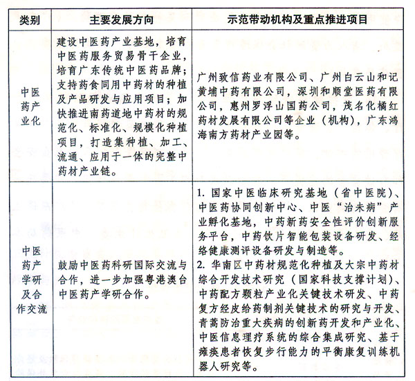 (六)培育發展健康服務業相關支撐產業。 18.重點推進醫藥產業研發和應用。著力發展醫藥和醫療器械產業,引導企業加大具有自主知識產權的新藥和醫療器械新產品的研發和成果轉化力度,提升企業創新能力和核心競爭力。以現代化中藥、生物醫藥、特色化學原料藥、藥物制劑、體外診斷試劑、高端醫療器械、康復輔助器具和新型智能康復系統與設備及關鍵制藥裝備、健康穿戴裝備等為重點,開發具有自主知識產權的產品和技術。強化先進醫療技術發明應用推廣,加快實施廣東創新醫療器械產品應用示范工程,促進創新醫療器械產品的應用和普及,培育一批擁有自主知識產權和核心競爭力的高端醫療器械高新技術企業。(省科技廳、食品藥品監管局、經濟和信息化委負責,省衛生計生委、發展改革委參與)
