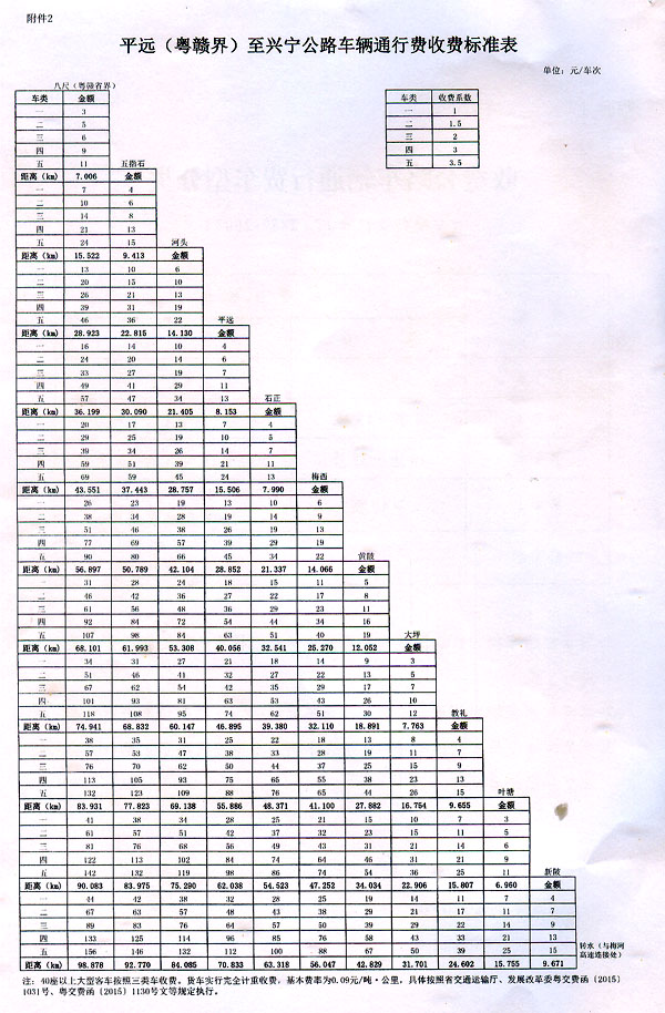 粵交費〔2015〕1207號請示收悉。同意平遠(粵贛界)至興寧公路建成通車和收費站收費設(shè)施經(jīng)驗收符合省聯(lián)網(wǎng)收費技術(shù)要求后開始收費,收費車型按國家統(tǒng)一標準進行分類,一至五類車的收費系數(shù)分別為1、1.5、2、3、3.5,收費標準為0.45元/標準車公里;貨車實行完全計重收費,基本費率為0.09元/噸·公里。