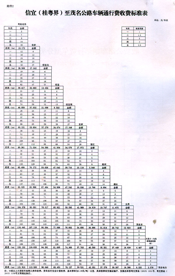 粵交費〔2015〕1200號請示收悉。同意信宜(桂粵界)至茂名公路建成通車和收費站收費設施經驗收符合省聯網收費技術要求后開始收費,收費車型按國家統一標準進行分類,一至五類車的收費系數分別為1、1.5、2、3、3.5,收費標準為0.45元/標準車公里;貨車實行完全計重收費,基本費率為0.09元/噸·公里。