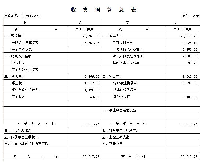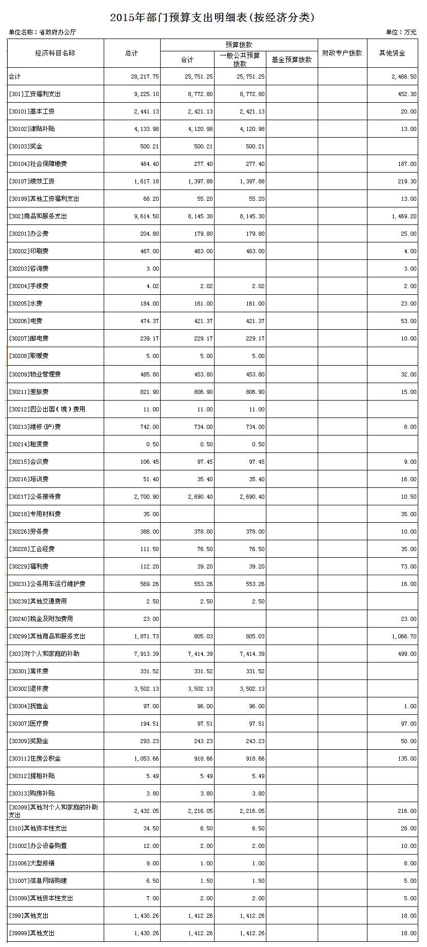 2015年支出預算28,217.75萬元,其中:基本支出20,577.75萬元,占預算撥款支出的72.92%;項目支出7,640.00萬元,占預算撥款支出的27.08%。(支出明細詳見附表)