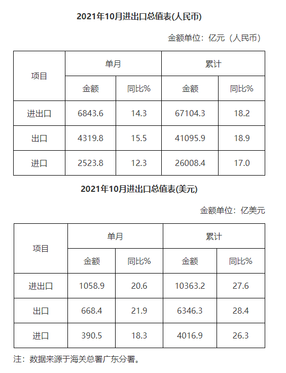廣東省外貿進出口總值表(2021年10月)
