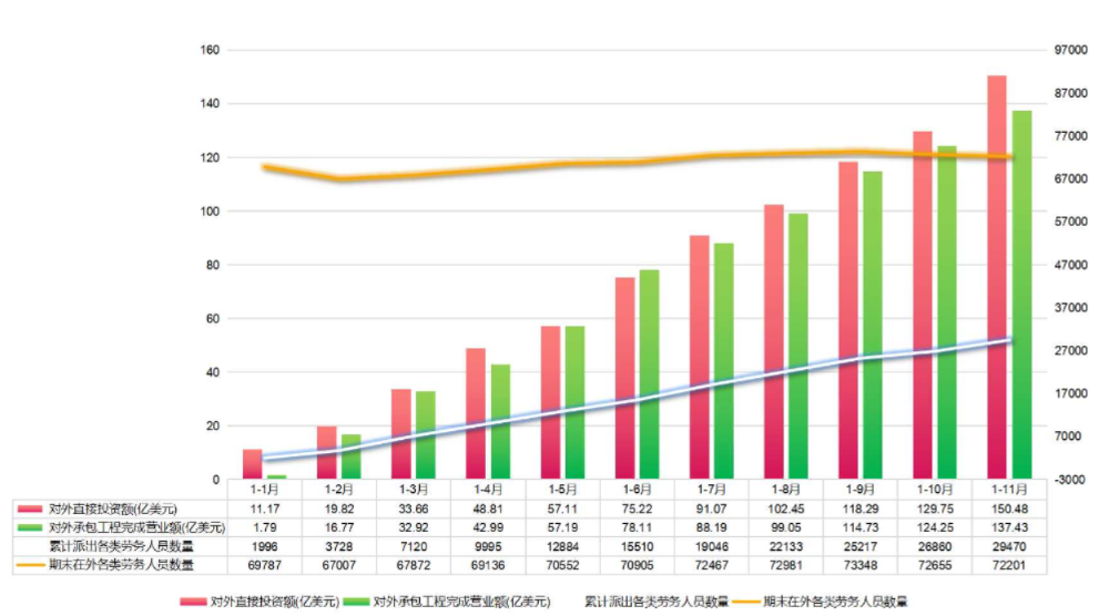 2021年1-11月,我省對外非金融類直接投資額150.48億美元,同比增長4.37%。對外承包工程完成營業額137.43億美元,勞務項下和工程項下累計派出各類勞務人員29470人,期末在外各類勞務人員72201人。