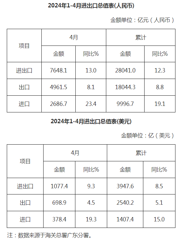 廣東省外貿(mào)進(jìn)出口總值表(2024年1-4月)