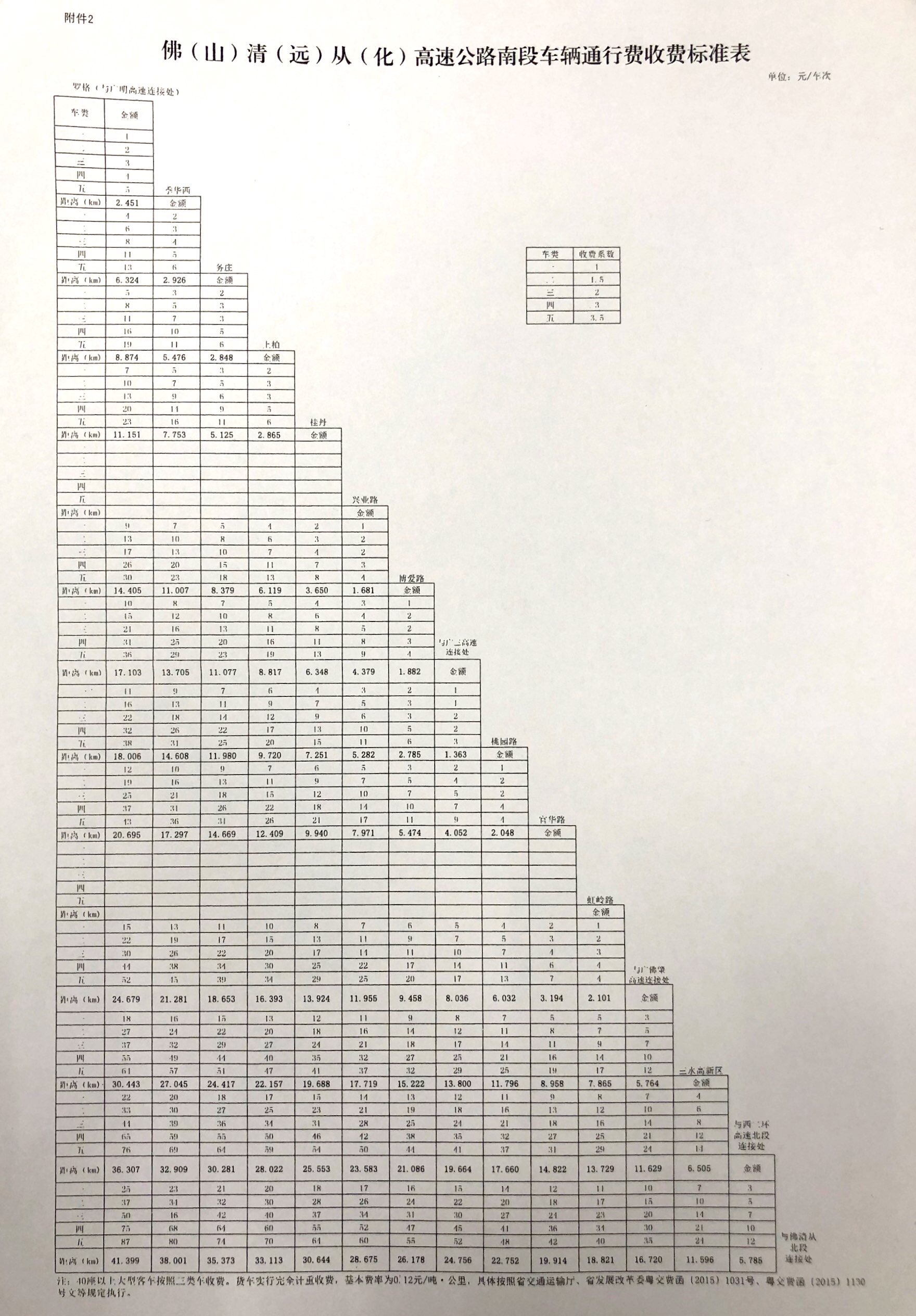 粵交費〔2019〕98號請示收悉。同意佛(山)清(遠)從(化)高速公路南段交工驗收通車和收費站收費設施經驗收符合省聯網收費技術要求后開始收費,收費車型按國家統一標準進行分類,1至5類車的收費系數分別為1、1.5、2、3、3.5,收費費率為0.60元/標準車公里;貨車實行完全計重收費,基本費率為0.12元/噸·公里。