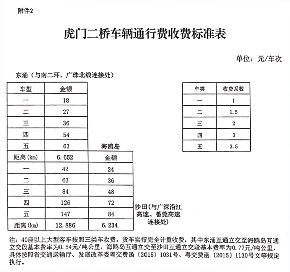 粵交費〔2019〕160號請示收悉。同意虎門二橋交工驗收通車和收費站收費設施經驗收符合省聯網收費技術要求后開始收費,收費車型按國家統一標準進行分類,1至5類車的收費系數分別為1、1.5、2、3、3.5,客車實行按次計費,東涌互通立交至海鷗島互通立交段收費標準為18元/標準車次,海鷗島互通立交至沙田互通立交段收費標準為24元/標準車次;貨車實行完全計重收費,東涌互通立交至海鷗島互通立交段基本費率為0.54元/噸公里,海鷗島互通立交至沙田互通立交段基本費率為0.77元/噸公里。 ? ? ? ??