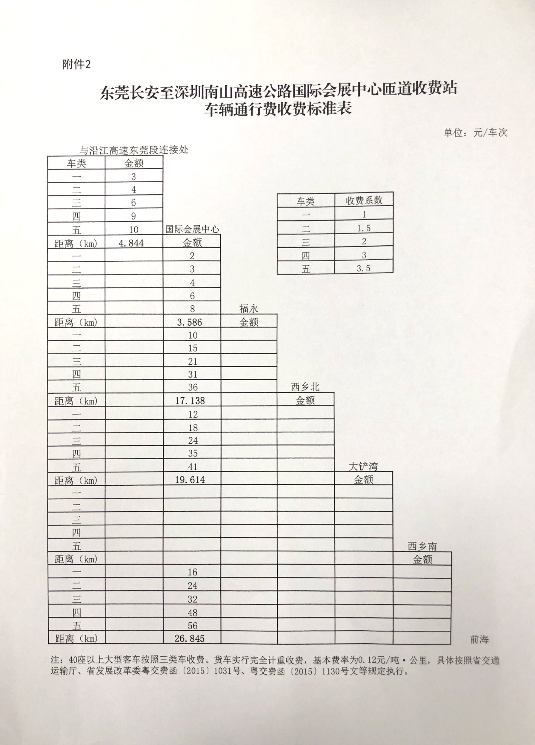 2.?東莞長(zhǎng)安至深圳南山高速公路國(guó)際會(huì)展中心收費(fèi)站車輛通行費(fèi)收費(fèi)標(biāo)準(zhǔn)表