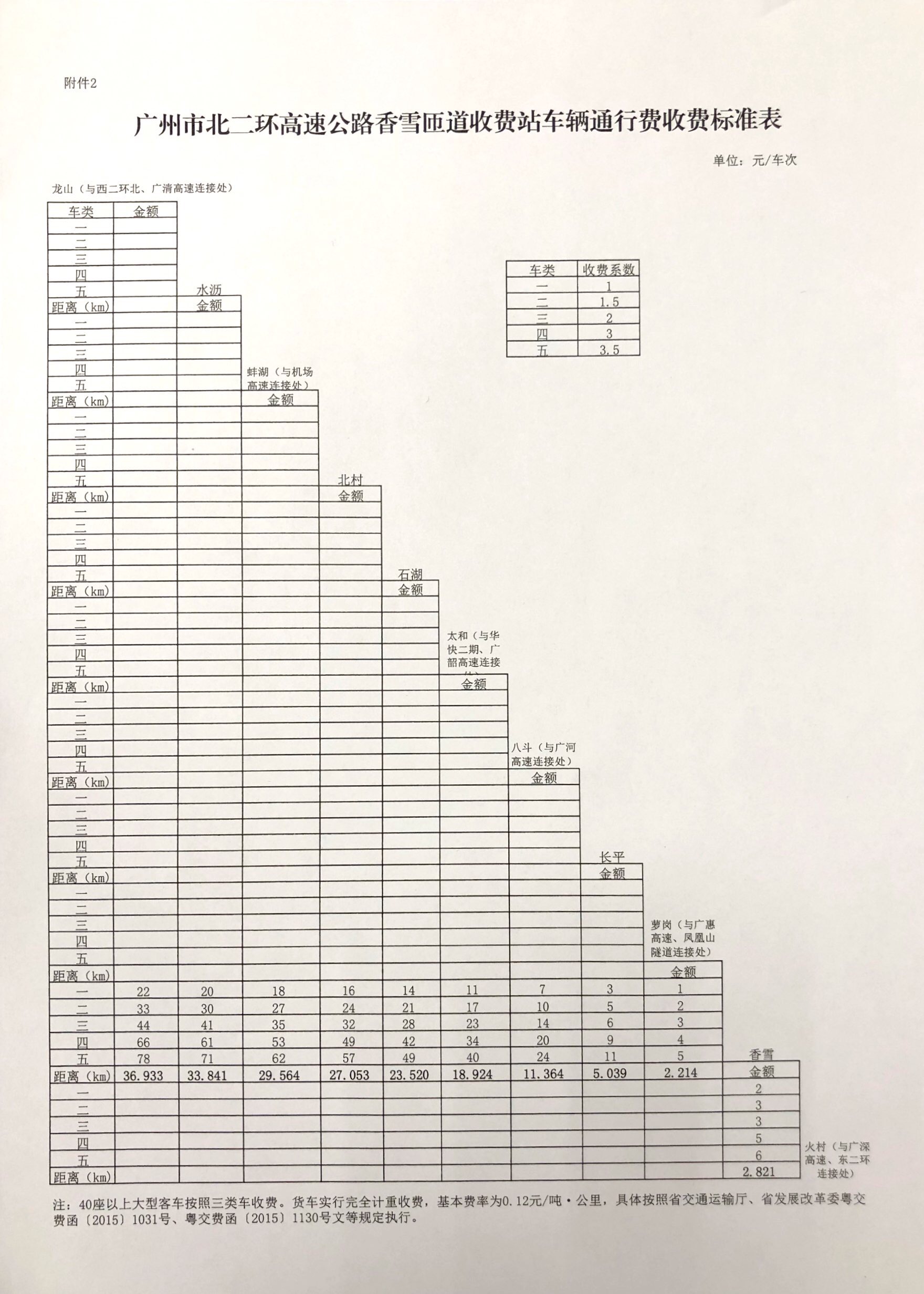 2.?廣州市北二環高速公路香雪匝道收費站車輛通行費收費標準表