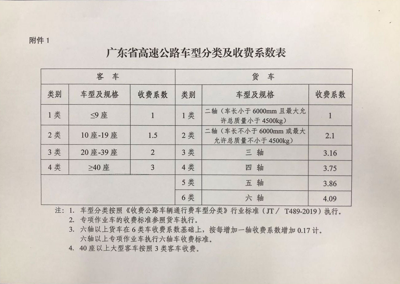 《關于廣東省龍川至懷集公路桃源北匝道收費站車輛通行費收費標準的請示》(粵交營〔2020〕483號)收悉。同意廣東省龍川至懷集公路桃源互通立交交工驗收通車和收費設施經驗收符合聯網收費技術要求后開始收費,收費車型執行《收費公路車輛通行費車型分類》(JT/T489-2019),收費費率為0.45元/標準車公里,1至4類客車的收費系數分別為1、1.5、2、3,1至6類貨車的收費系數分別為1、2.1、3.16、3.75、3.86、4.09,專項作業車的收費標準參照貨車執行。