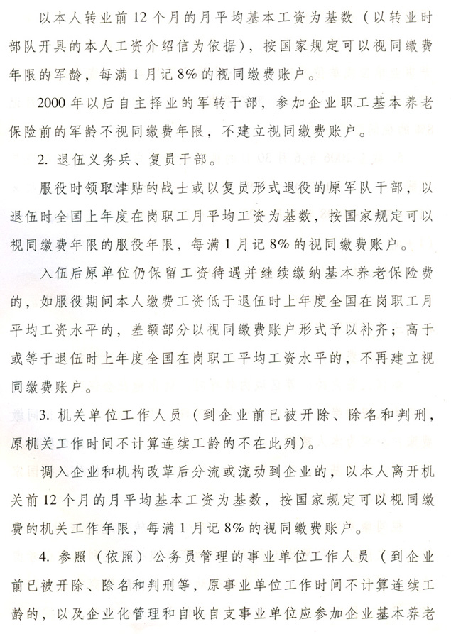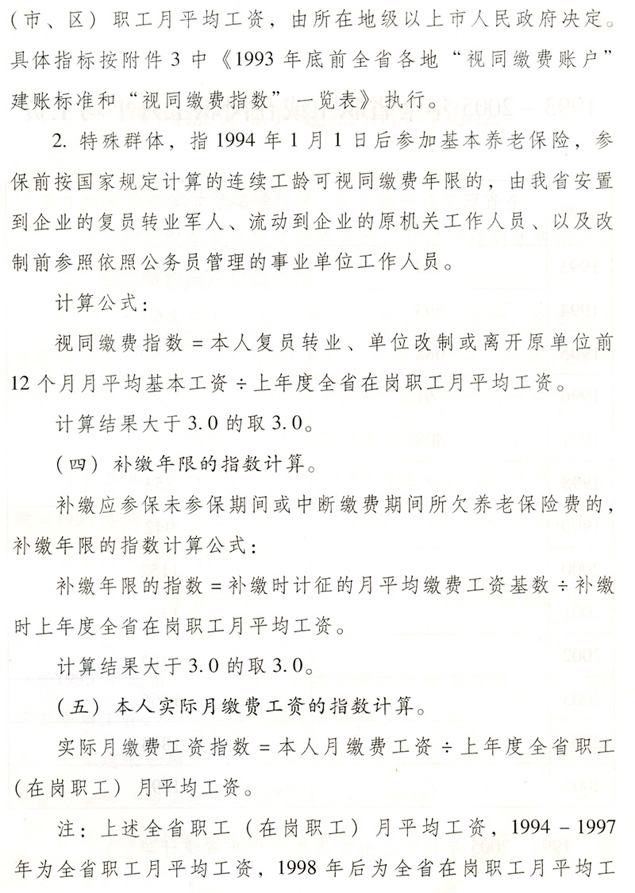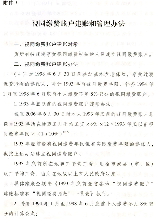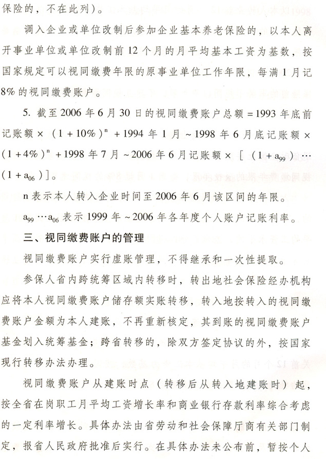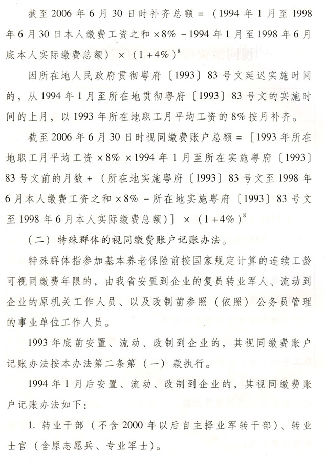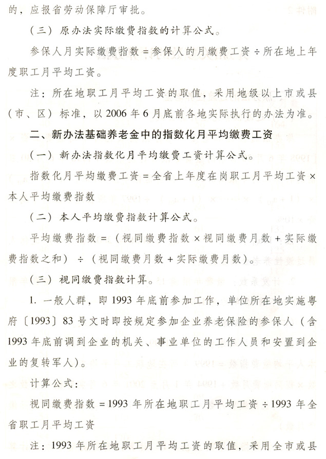 關于貫徹國務院完善企業職工基本 養老保險制度決定的通知 各地級以上市人民政府,各縣(市、區)人民政府,省政府各部門、各直屬機構: 為全面深入貫徹落實《國務院關于完善企業職工基本養老保險制度的決定》(國發〔2005〕38號),進一步推進廣東省社會保障體系建設,決定自2006年7月1日起調整完善廣東省企業職工基本養老保險制度,現就有關工作通知如下: 一、調整個人賬戶記賬規模 從2006年7月1日起,統一將全省企業職工基本養老保險個人賬戶規模從本人繳費工資的11%調整為8%。2006年6月30日前的個人賬戶與2006年7月1日后的個人賬戶合并計算。 各地要做好清理審核調整前后的個人賬戶數據和個人賬戶記錄工作,實現個人賬戶的規范化管理。 二、調整養老保險繳費基數 個人繳費以參保人月應稅工資、薪金收入為基數。參保人月應稅工資、薪金高于全省上年度在崗職工月平均工資300%的,以全省上年度在崗職工月平均工資的300%為繳費基數;參保人月應稅工資、薪金收入低于全省上年度在崗職工月平均工資60%的,以全省上年度在崗職工月平均工資的60%為繳費基數。 參保人所在市(地級以上市,下同)上年度在崗職工月平均工資低于全省上年度在崗職工月平均工資,且本人月應稅工資、薪金低于全省上年度在崗職工月平均工資60%的,可按不低于所在市上年度在崗職工月平均工資的60%為繳費基數,以后逐步過渡到以全省上年度在崗職工月平均工資的60%為繳費基數。 城鎮個體工商戶和靈活就業人員,原則上以全省上年度在崗職工月平均工資為繳費基數。所在市上年度在崗職工月平均工資低于全省上年度在崗職工月平均工資的,也可從所在市上年度在崗職工月平均工資的60%起步,逐步過渡到全省上年度在崗職工月平均工資。 經申報并已核定的2006年6月底前的繳費基數不再重新核定。 三、改革基本養老金計發辦法 從2006年7月1日起,改革企業基本養老金計發辦法。2006年6月30日前已申領基本養老金的參保人,仍按原辦法計發基本養老金,同時執行本通知規定的年度調整辦法。 (一)享受基本養老金的條件。 參保人符合下列條件之一的,可申請按月領取基本養老金: 1.1998年7月1日后參加基本養老保險,達到國家規定退休年齡,累計繳費年限(含視同繳費年限,下同)滿15年的; 2.1998年6月30日前參加基本養老保險,2013年6月30日前達到國家規定的退休年齡,累計繳費年限滿10年的; 3.1998年6月30日前參加基本養老保險,2013年7月1日后達到國家規定的退休年齡,累計繳費年限滿15年的; 41998年6月30日前應參保未參保,1998年7月1日以后辦理參保補繳手續,達到國家規定的退休年齡,累計繳費年限滿15年的。 (二)基本養老金計發辦法。 1.1998年7月1日后參加基本養老保險的參保人,基本養老金由基礎養老金和個人賬戶養老金組成。 ?。?)基礎養老金月標準為: 基礎養老金=(全省上年度在崗職工月平均工資+本人指數化月平均繳費工資)÷2×繳費年限(含視同繳費年限)×1% 本人指數化月平均繳費工資的計算辦法見附件2。 參保人指數化月平均繳費工資低于全省上年度在崗職工月平均工資的60%的,基礎養老金月標準為: 基礎養老金=(全省上年度在崗職工月平均工資×a+本人指數化月平均繳費工資)÷2×繳費年限(含視同繳費年限)×1% a=本人平均繳費指數÷0.6,今后可隨廣東省區域經濟發展情況進行適當調整。 基礎養老金從基本養老保險統籌基金中支付。 (2)個人賬戶養老金月標準為: 以本人首次領取基本養老金時個人賬戶儲存額除以計發月數,計發月數按國發〔2005〕38號文的規定執行(見附件1)。個人賬戶養老金從本人個人賬戶基金中支付。 2.具有視同繳費權益并建立了視同繳費賬戶的下列參保人,在計發基礎養老金和個人賬戶養老金的基礎上,再計發過渡性養老金: ?。?)1998年6月30日前參加基本養老保險,2006年7月1日以后符合按月領取基本養老金條件的; ?。?)1998年7月1日后參加基本養老保險,參保前具有按國家規定的視同繳費年限,2006年7月1日后符合按月領取基本養老金條件的。 3.首次領取的過渡性養老金月標準為: ?。?)1998年6月30日前參加基本養老保險的,以首次領取基本養老金時本人視同繳費賬戶總額除以120; ?。?)1998年7月1日后參加基本養老保險,2006年6月30日前已具有按國家規定的視同繳費年限的,以本人視同繳費賬戶總額除以120;2006年7月1日后開始具有按國家規定的視同繳費年限的,以本人視同繳費賬戶總額除以個人賬戶計發月數。 過渡性養老金從基本養老保險統籌基金中支付。 各級社會保險經辦機構要在2008年年底前完成參保人視同繳費賬戶的核定與建賬工作。視同繳費賬戶的建賬與管理辦法見附件3。 (三)過渡期計發辦法。 為保證基本養老金新計發辦法與原計發辦法的平穩過渡,設置5年過渡期(2006年7月1日至2011年6月30日),過渡期內實行將新辦法與原辦法對比并按差額計發基本養老金的做法。 1.對過渡期內申領基本養老金的參保人,按新辦法計算的基本養老金低于按原辦法計算的基本養老金的,其差額部分作為補差計發。 按新辦法計算的基本養老金高于按原辦法計算的基本養老金的,高出部分按下列比例計發:2006年7月1日至2007年6月30日期間首次領取待遇的計發10%;2007年7月1日至2008年6月30日期間首次領取待遇的計發30%;2008年7月1日至2009年6月30日期間首次領取待遇的計發50%;2009年7月1日至2010年6月30