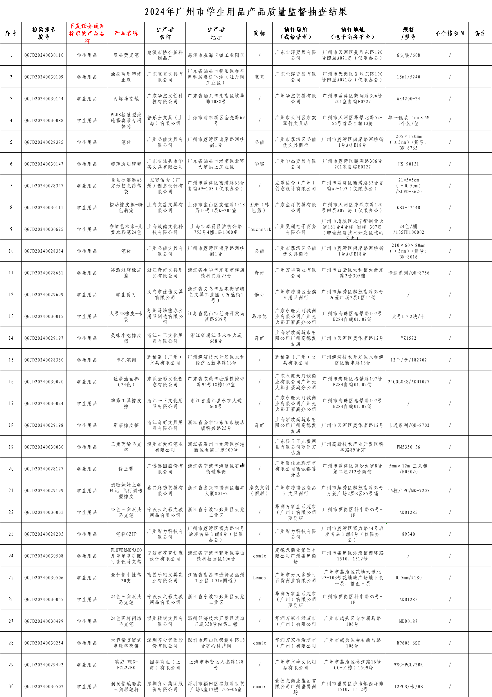 附件:2024年廣州市學生用品產品質量監督抽查結果